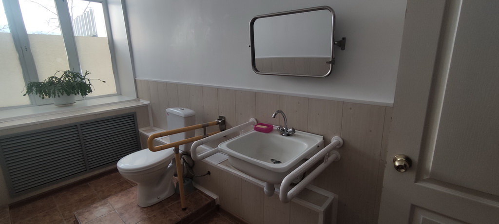 В техникуме есть санитарная комната с соблюдением всех условий охраны здоровья для инвалидов и лиц с ограниченными возможностями здоровья. Оборудованная поручнями для удобства перемещения, крючками для костылей, панелью вызова и поворотно-откидным зеркалом которое при наличие рукоятки дает возможность регулировки любого угла наклона зеркала и обеспечивает возможность инвалидам, перемещающимся в кресле-коляске, без труда воспользоваться изделием по назначению.